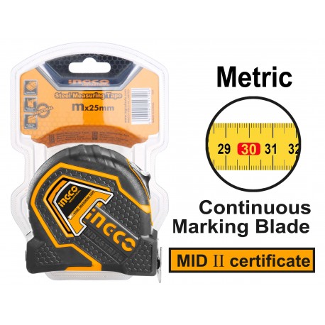 Flessometro Ingco HSMT88051E, 5mt x 25mm, certificato MID II. Nastro a doppia scala rivestito in nylon e cassa bi-componente in gomma anti-shock per la massima resistenza e precisione professionale.