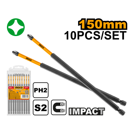 Set 10 pz bit PH2 150 mm INGCO SDBIM11PH263 – acciaio S2 industriale, costruzione resistente, per lavori professionali.