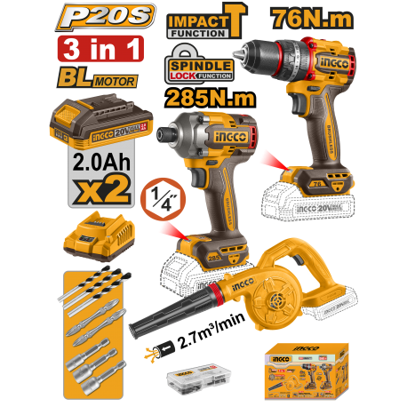 Il kit professionale INGCO modello COSLI250182E è la centrale di forza cordless per il tuo lavoro. Questo set combina un trapano a percussione da 76Nm e un avvitatore a impulsi da 285Nm, entrambi dotati di motori **Brushless** ad alta efficienza. Insieme al soffiatore e alle due batterie da 2.0Ah incluse, avrai tutto il necessario per affrontare forature pesanti, serraggi strutturali e la pulizia finale del cantiere con un unico ecosistema.