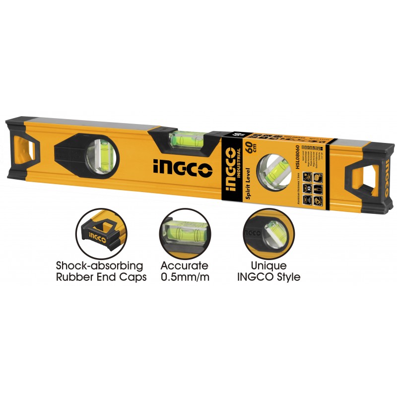 Livella a bolla professionale Ingco, modello HSL08060, con una lunghezza di 60 cm. Progettata per garantire misurazioni precise e una lunga durata in cantiere e in officina.