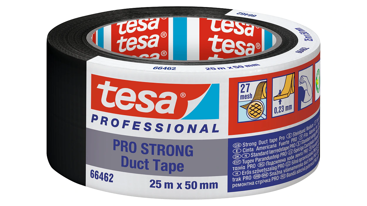 Il nastro telato Tesa PRO STRONG Duct Tape 66462 è una soluzione professionale, versatile e più sostenibile. Il suo supporto è realizzato con oltre il **60% di materiali riciclati** post-consumo. È dotato di un elevato potere di fissaggio grazie all'adesivo in gomma sintetica e garantisce una tenuta affidabile per riparazioni, sigillature e fissaggi. È idrorepellente, resistente a raggi UV e facilmente strappabile a mano.