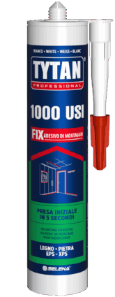 Adesivo di montaggio monocomponente a base acquosa Tytan FIX 1000 USI con elevata forza adesiva e presa iniziale in 5 secondi. Ideale per superfici assorbenti, è inodore e verniciabile.