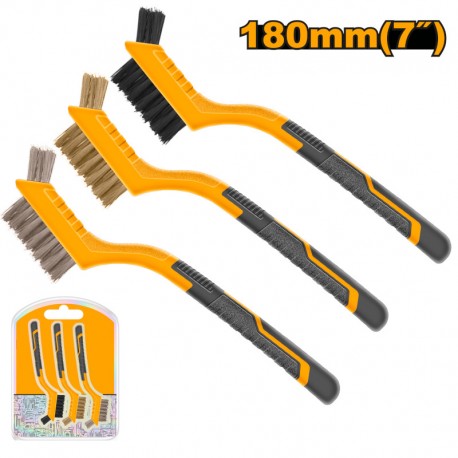 Set professionale Ingco (HKTWB10306) composto da 3 mini spazzole abrasive da 7" con setole in Nylon, Ottone e Filo d'Acciaio per pulizia versatile e di precisione.
