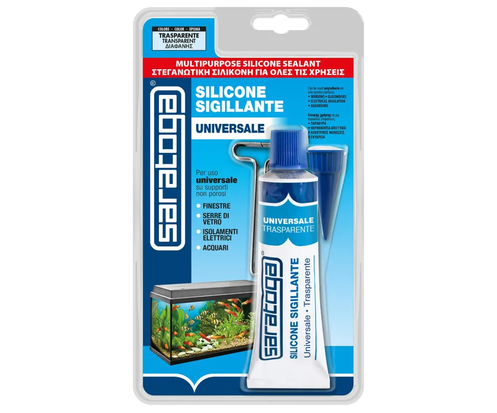 Sigillante acetico universale trasparente firmato SARATOGA, perfetto per incollaggi e sigillature discrete su superfici lisce. La sua elevata trasparenza e la resistenza alle temperature estreme lo rendono lo strumento versatile per ogni riparazione domestica e professionale su vetro e ceramica.