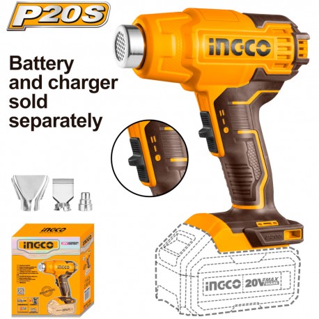 Termosoffiatore a batteria INGCO HGLI2002 20 V, temperatura 300‑550°C, flusso d’aria 100‑200 l/min, ideale per sverniciatura, riscaldamento materiali e lavori fai‑da‑te.
